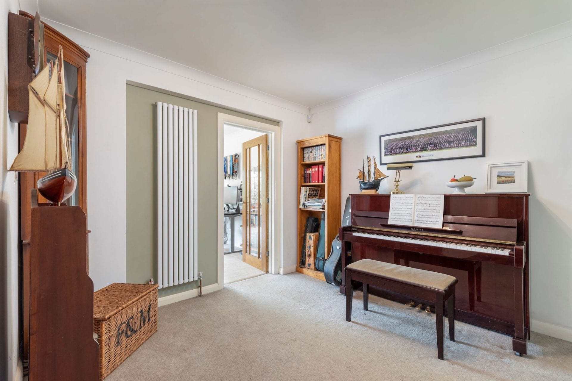 Beyond the grand staircase you pass a generous under-stairs cupboard, downstairs cloakroom and enter into the music room, a comfortable space where budding musicians can play. There is room for a piano, bookshelves and free-standing cupboards.