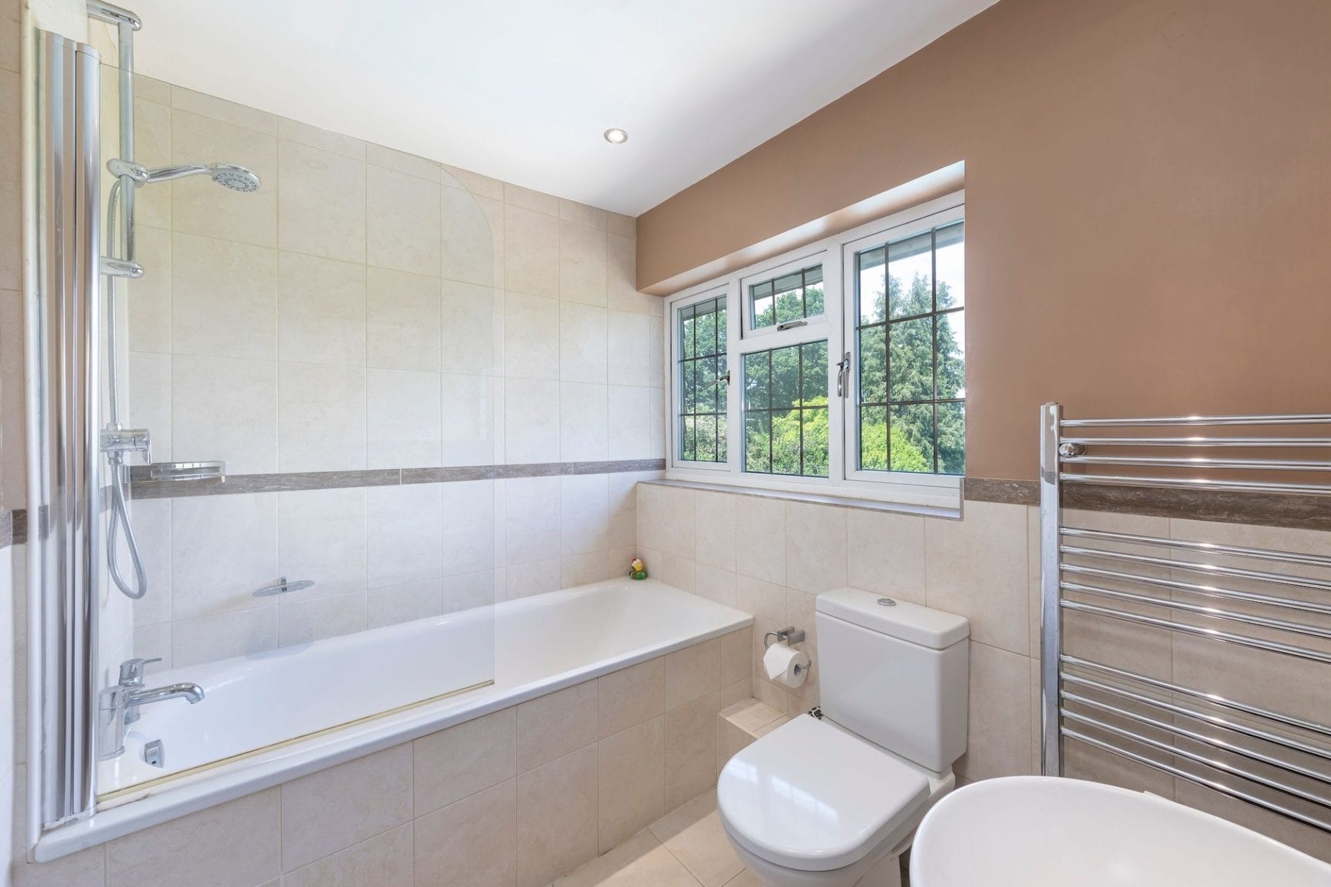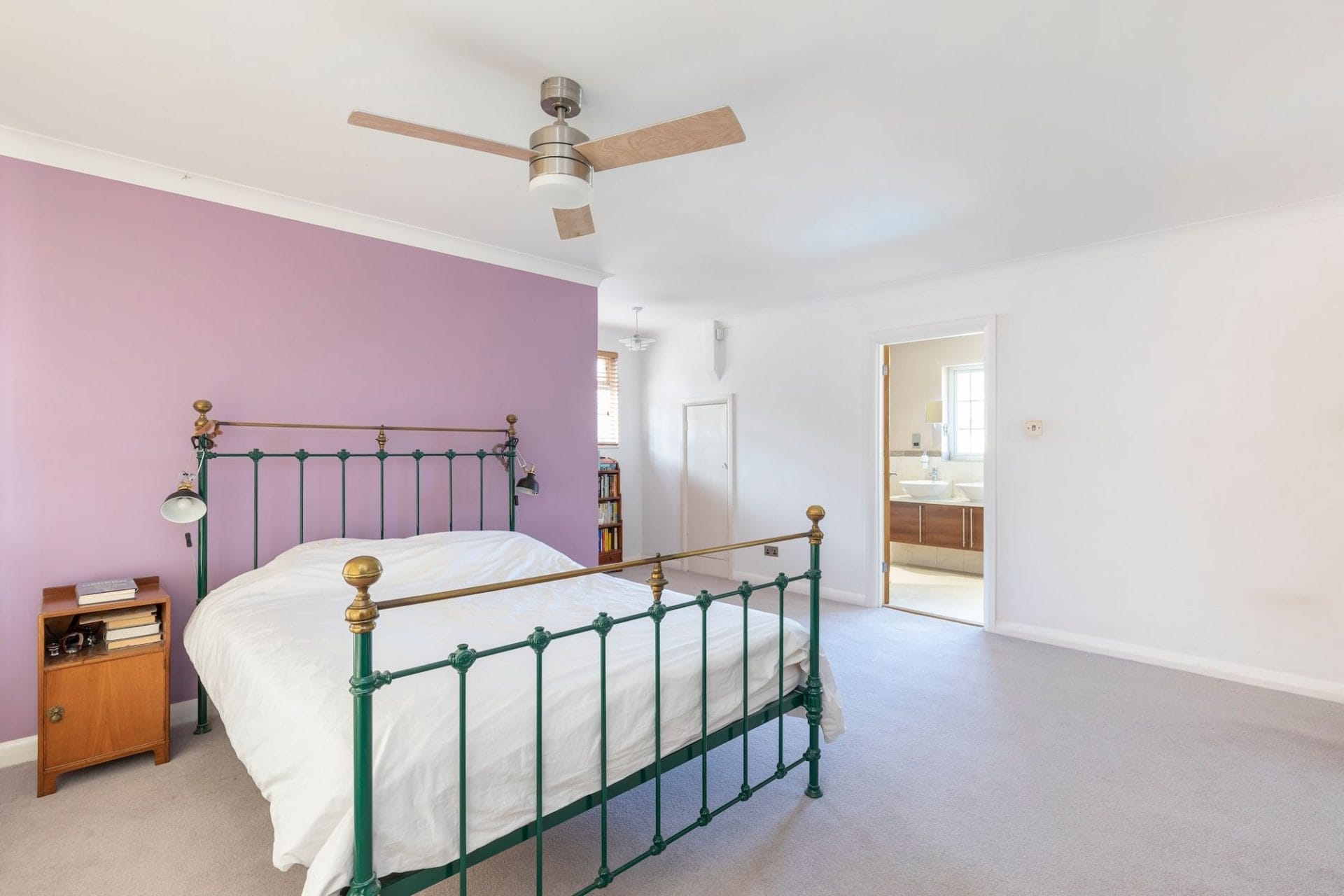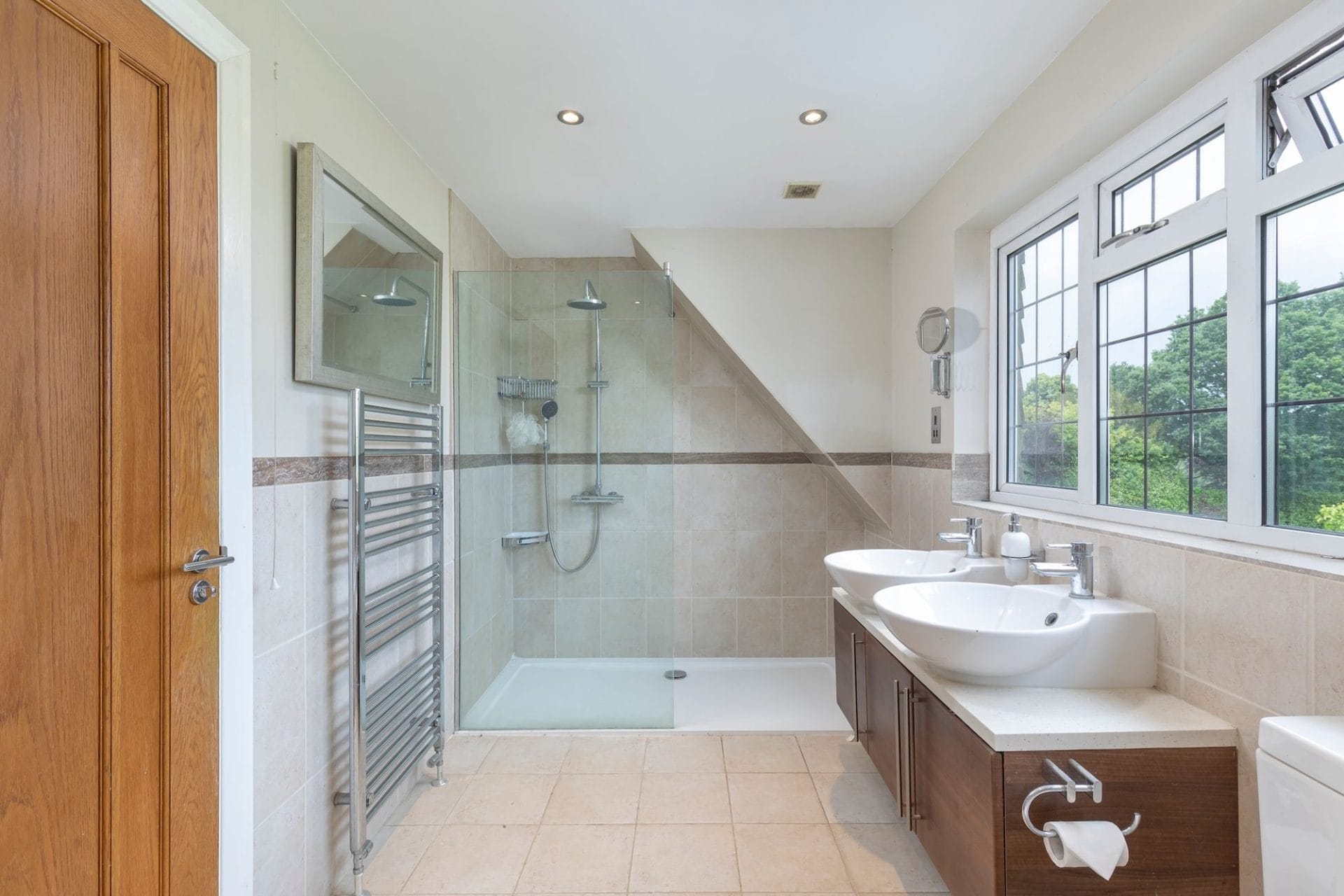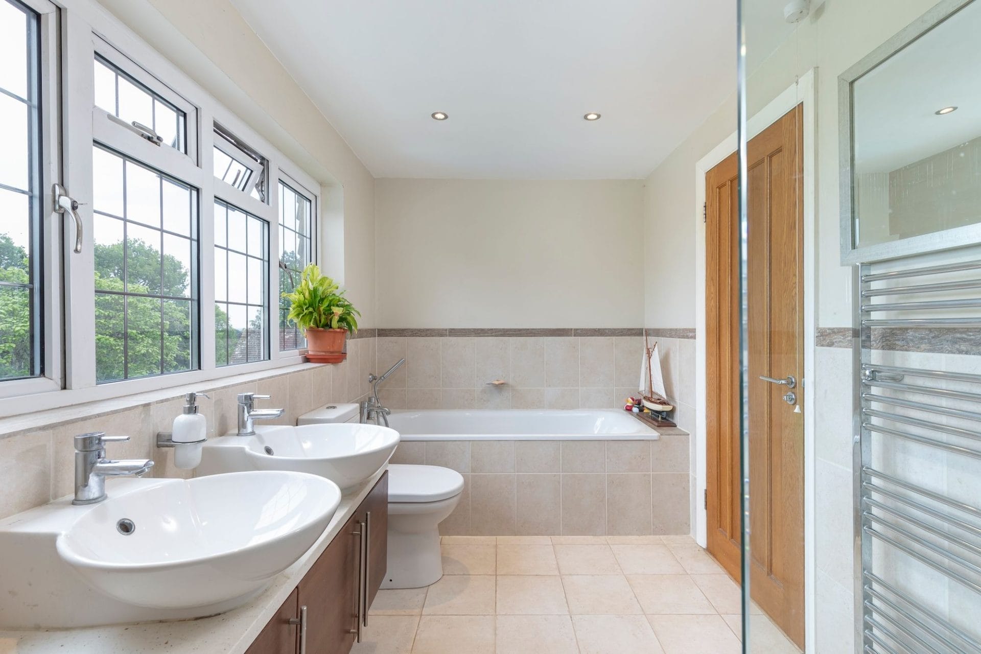 Climbing the turning staircase gives a wonderful opportunity to take in the views over the lawn and beyond. Wonderfully large windows allow the light to fill the space. A generous landing greets you on the first floor, with space for a sofa to enjoy a good book. The principle bedroom is to your right. This room is spacious in size and filled with glorious light. A walk-in wardrobe provides excellent storage, in addition to the eaves storage – a great place to hide suitcases. The modern en-suite is neutrally half-tiled to surround the bath and floor, and ‘his & hers’ sinks and tempting bath finish the space beautifully.