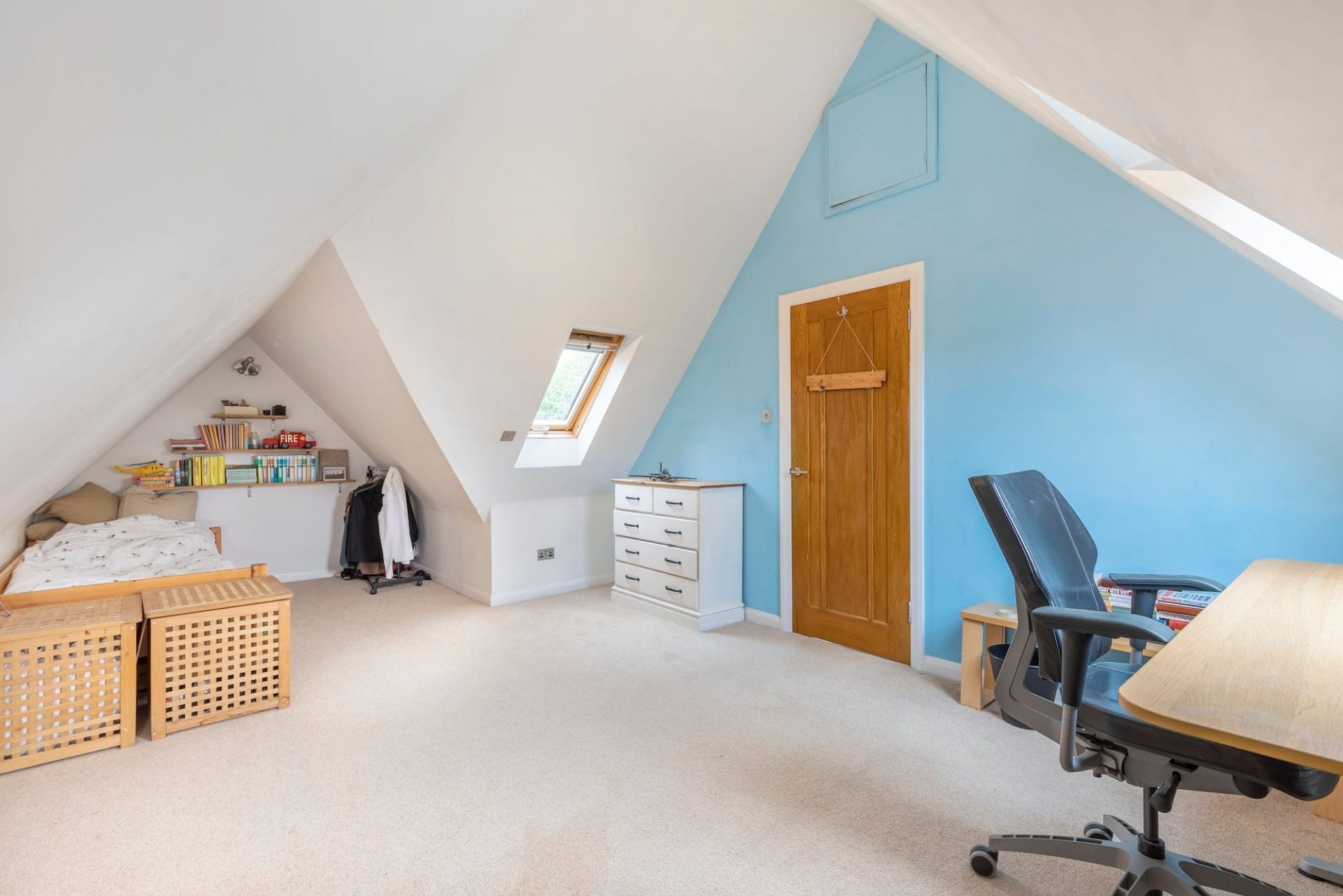 Continue your ascent to the second floor up the oak staircase and you are greeted with two further large attic bedrooms. To the right, a large ‘front to back’ bedroom can be found. With two skylights flooding the room with light and restricted height in places, this would make a wonderful child’s bedroom. On the opposite side is an equally spacious bedroom that enjoys views down the garden. Both these bedrooms have space for double beds, desk and additional storage units. There is also a family bathroom with separate shower and bath and twin wash basins with under cabinet storage and WC.