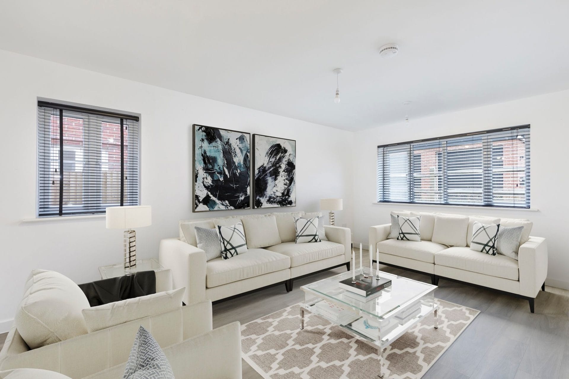 Double aspect living room with hard wood floors and underfloor heating.