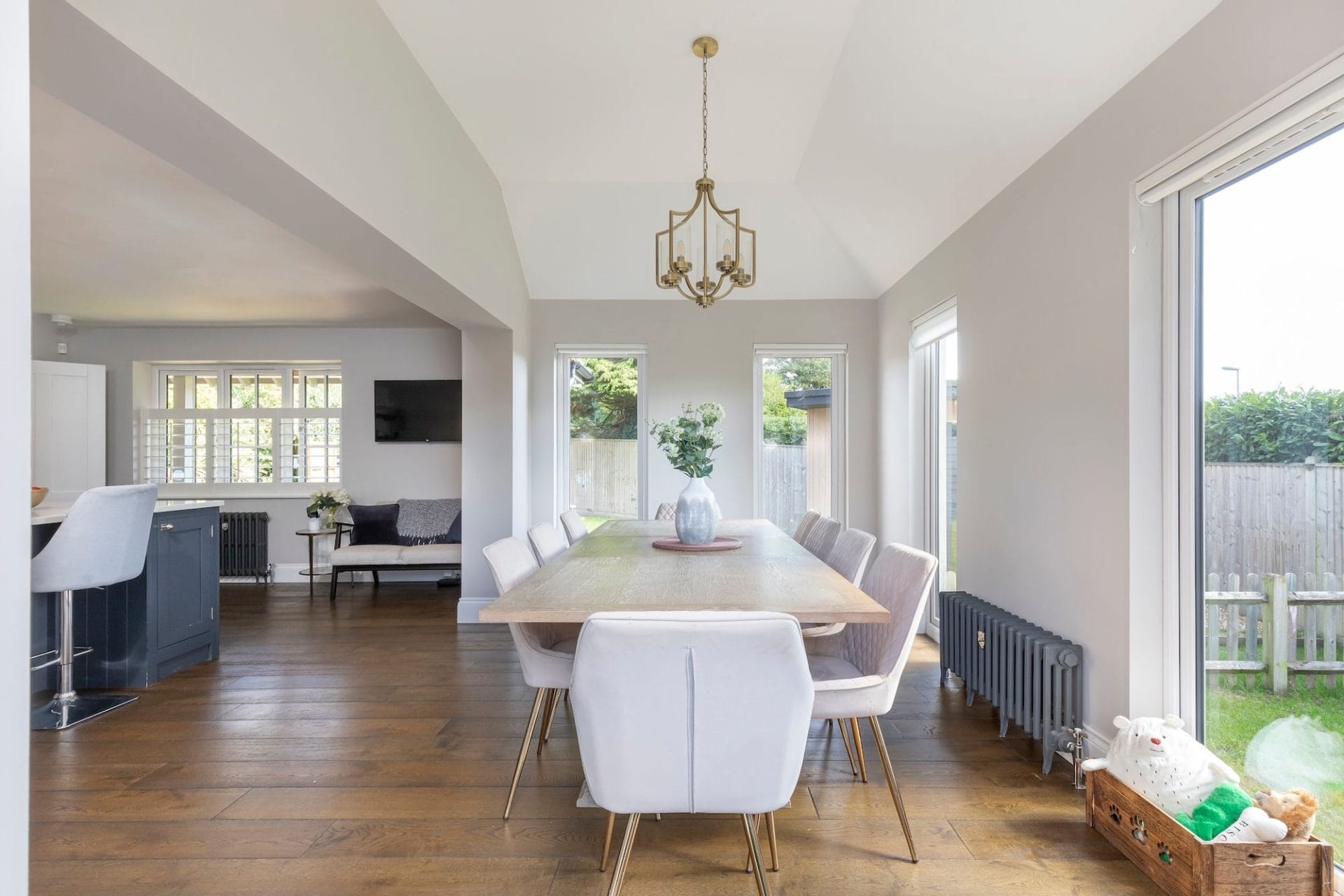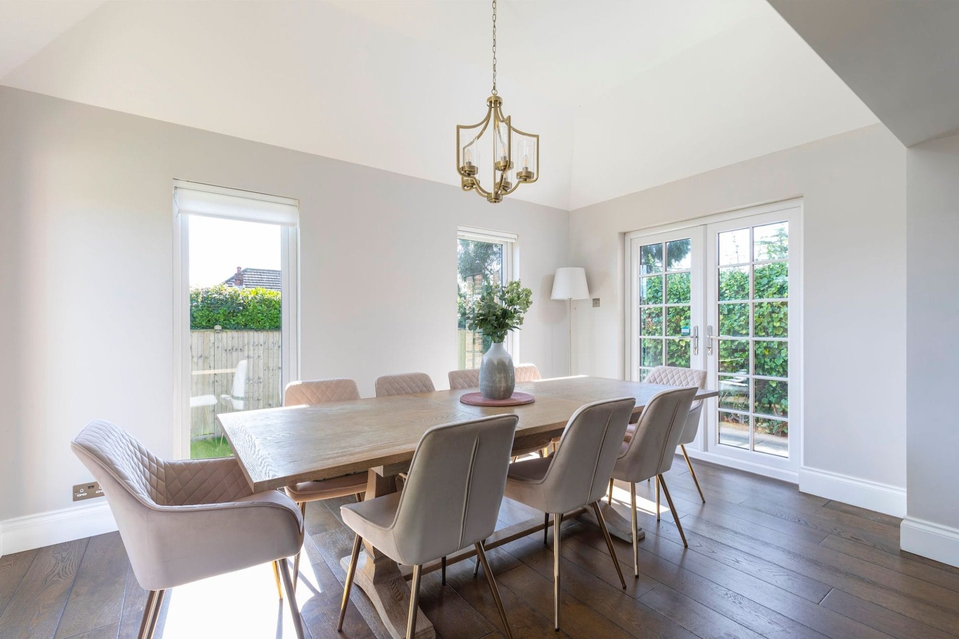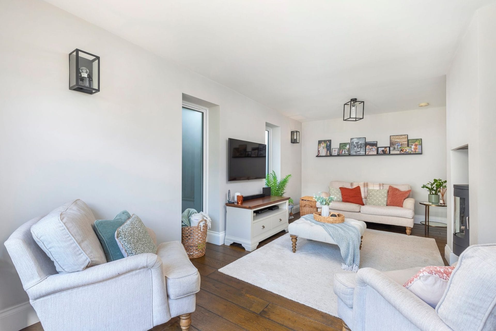 The main reception room is a warm and versatile space, perfect for both family gatherings and quieter moments of relaxation. A bio-ethanol stove adds a cosy focal point, while French doors open directly onto the garden, flooding the room with natural light and offering a seamless connection between indoors and outdoors.