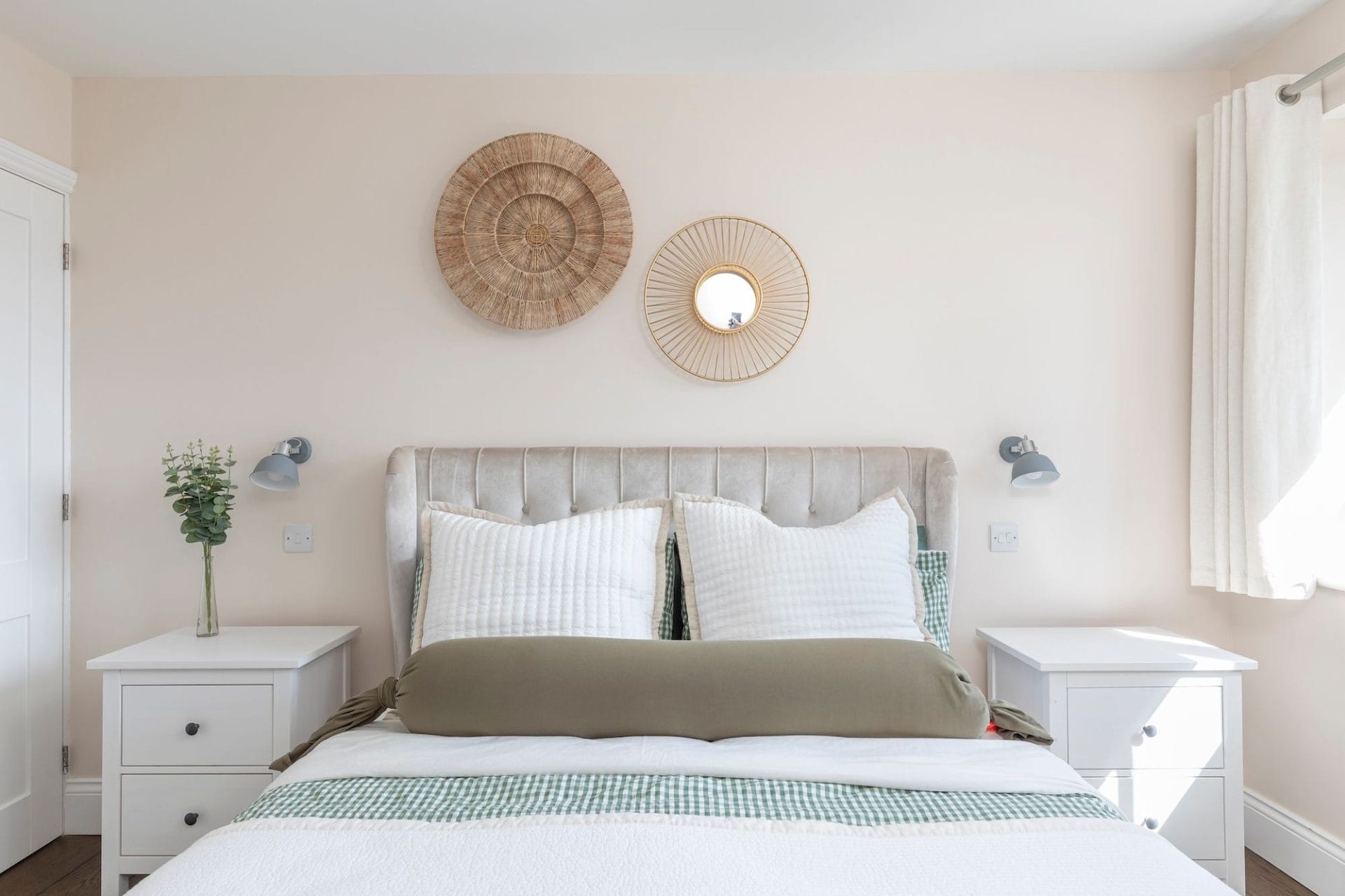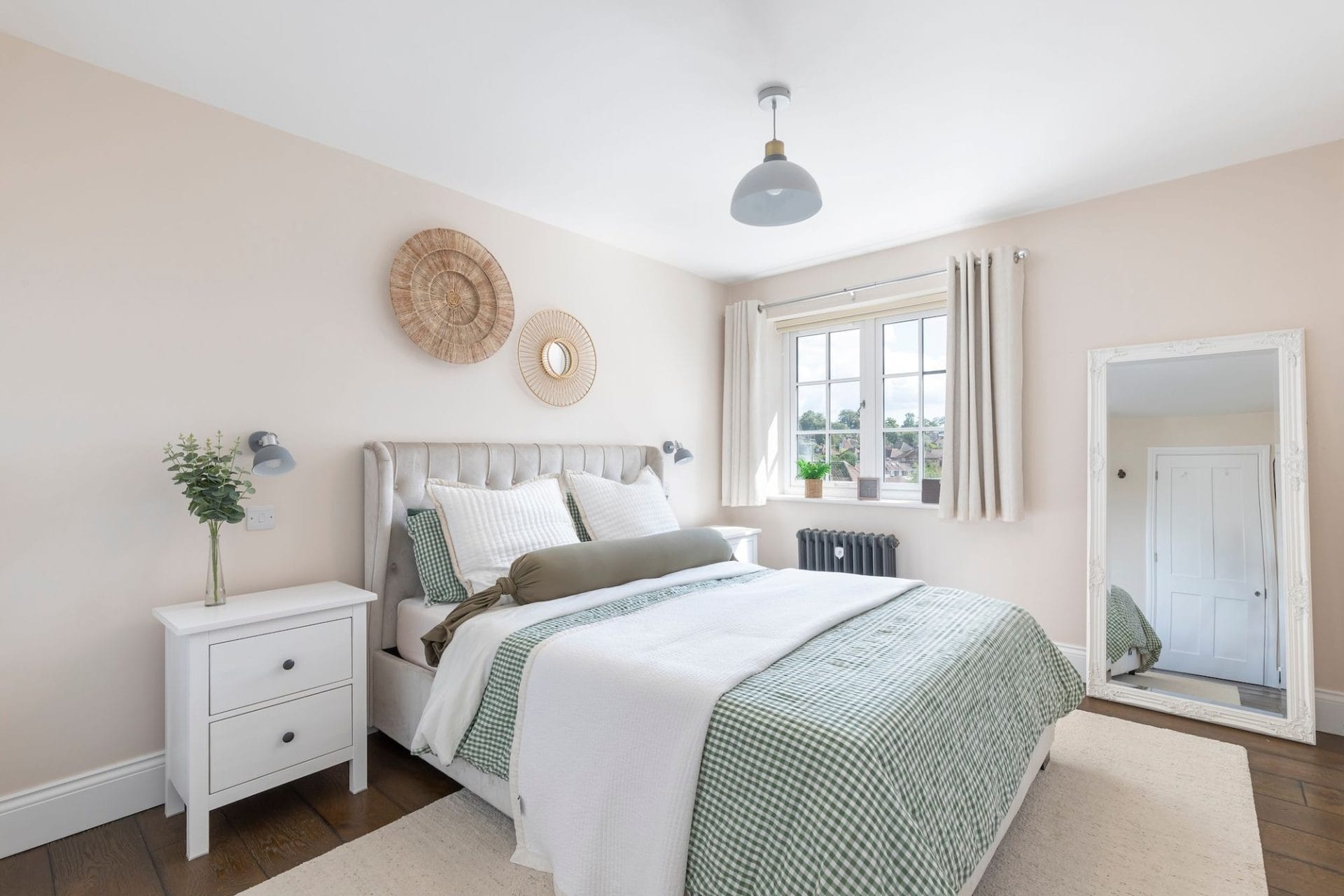 The principal bedroom exudes calm sophistication, with soft tones, elegant detailing, and a large picture window framing leafy views beyond. A sumptuous bed and layered textiles add warmth and comfort, making this a space that feels indulgent yet understated. The generous walk in wardrobe and additional fitted wardrobe offers ample space to keep clothes looking their very best, while the stylish en-suite shower room adds a touch of luxury to this wonderful bedroom.