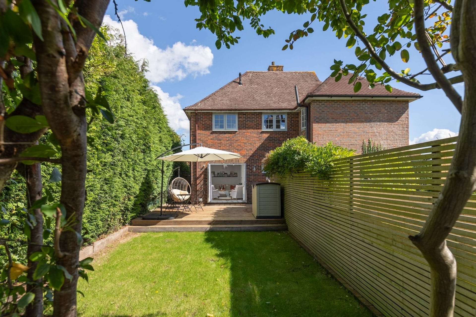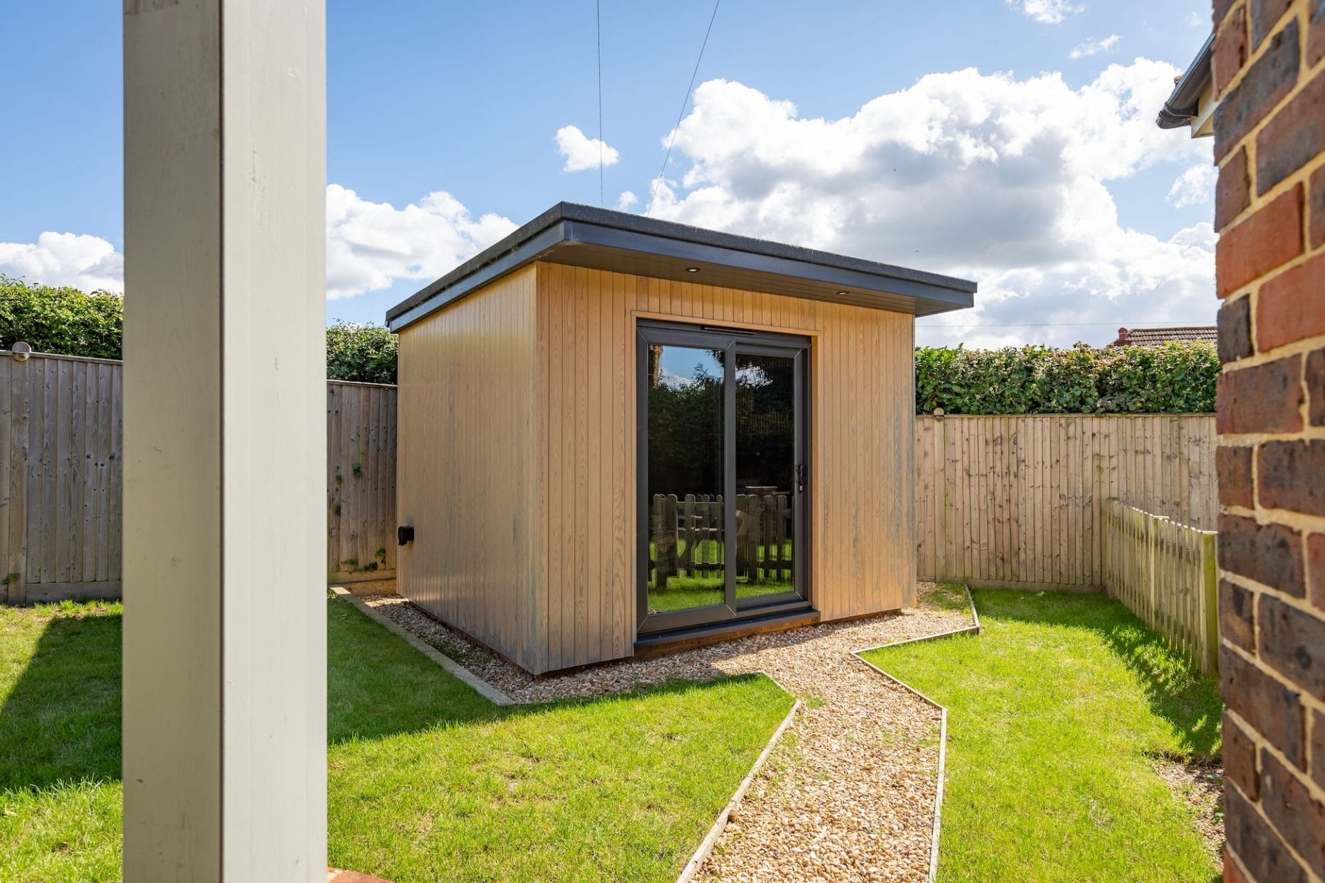 The private garden is a true extension of the home – ideal for both entertaining and family life. A patio off the reception room provides the perfect setting for summer dining, while the lawn offers space for play and relaxation. Mature borders and fencing create a sense of seclusion, with a garden shed providing additional storage. To the South East sits the bespoke garden office complete with wifi, heating and air conditioning and surrounded by lawn and mature planting. This is a garden designed to be enjoyed throughout the seasons.