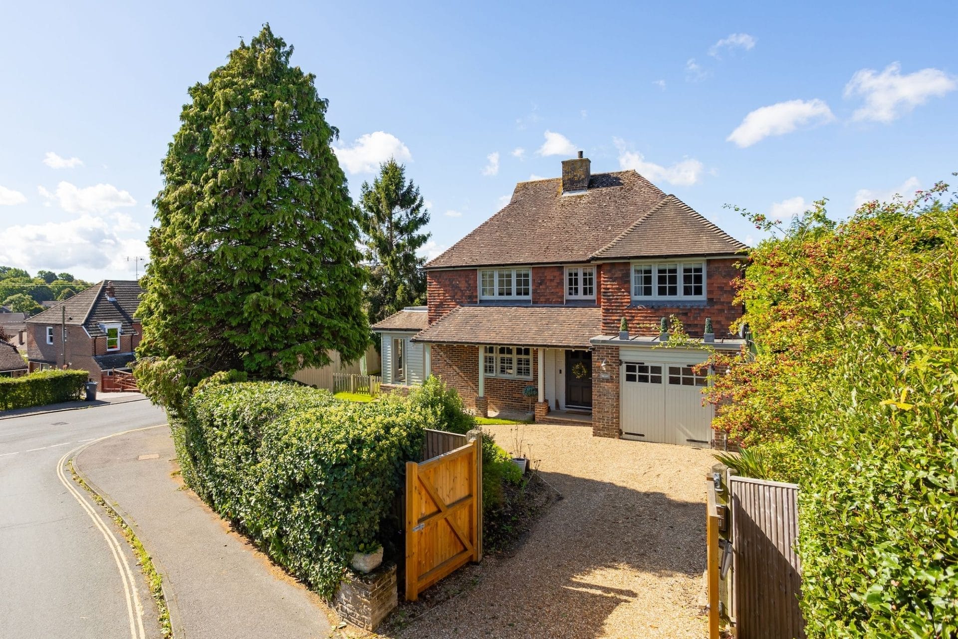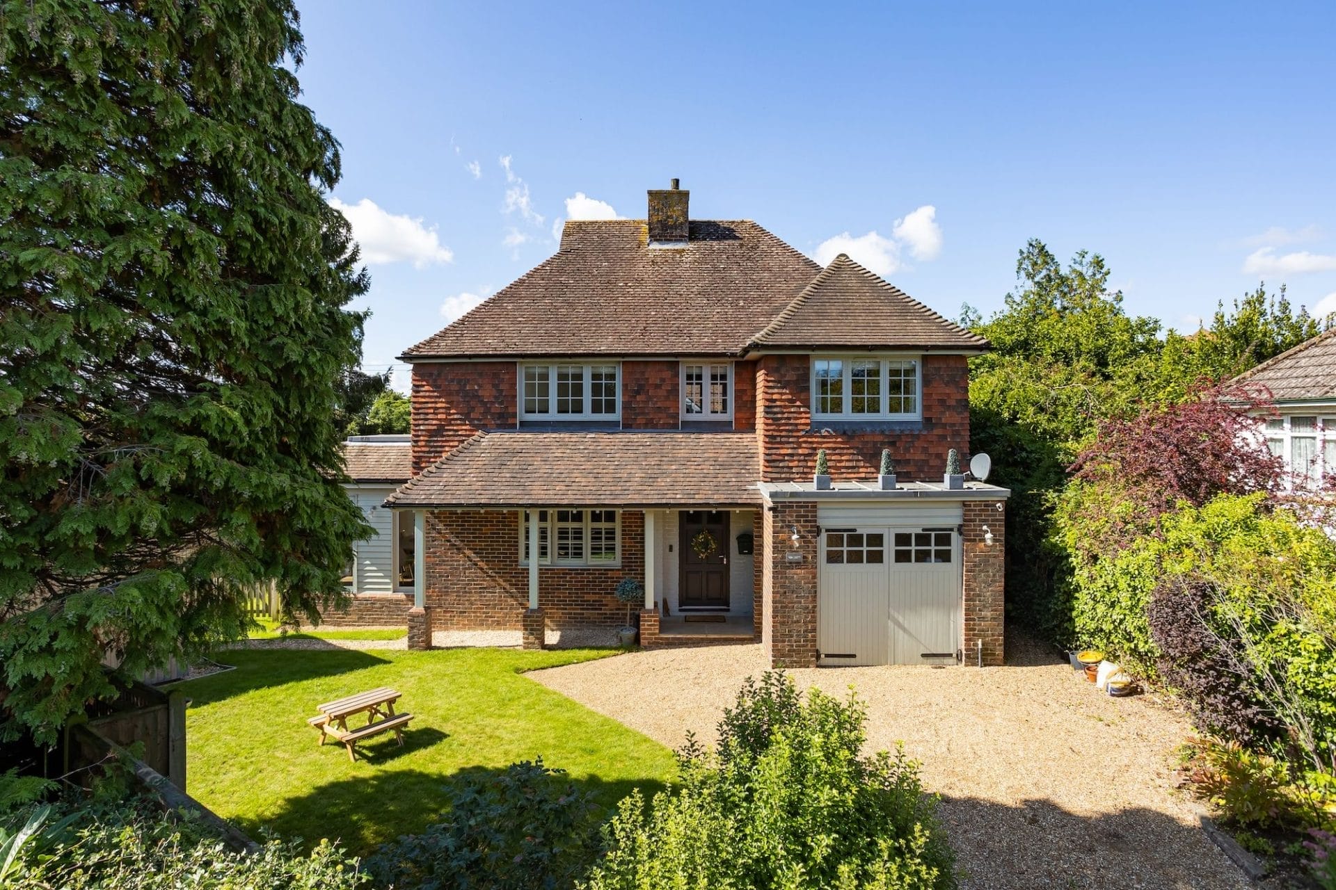 Tucked away in a peaceful residential setting, this handsome detached home makes a striking first impression. Its traditional red brick façade, pitched tiled roof, and welcoming covered porch speak of enduring charm and craftsmanship. A neatly landscaped front garden, framed by mature greenery, sets a tranquil scene, while a gravel driveway provides ample parking and leads to an integrated garage with elegant carriage-style doors.