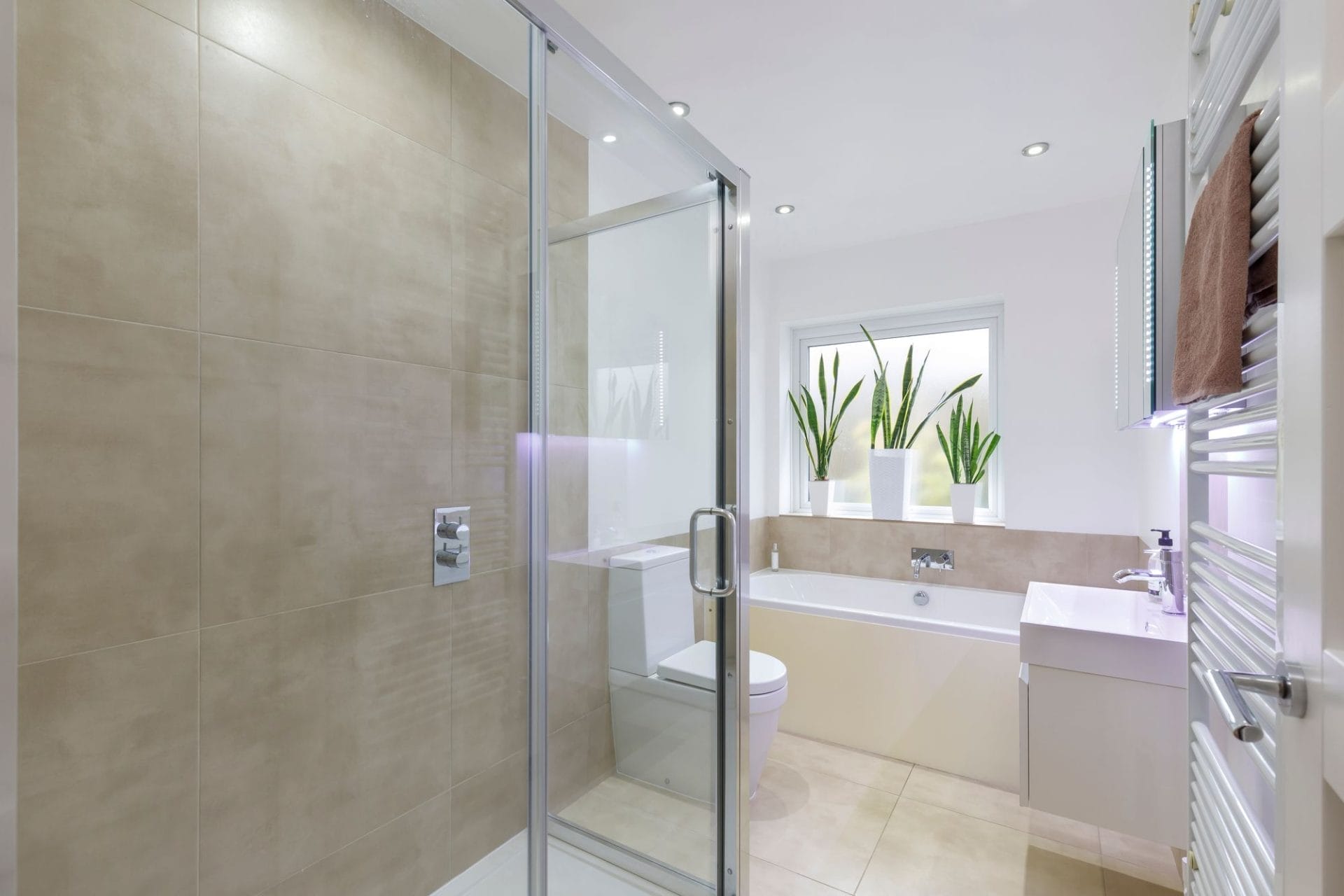 Family bathroom with separate shower and bath, wc, basin and heated towel rail.