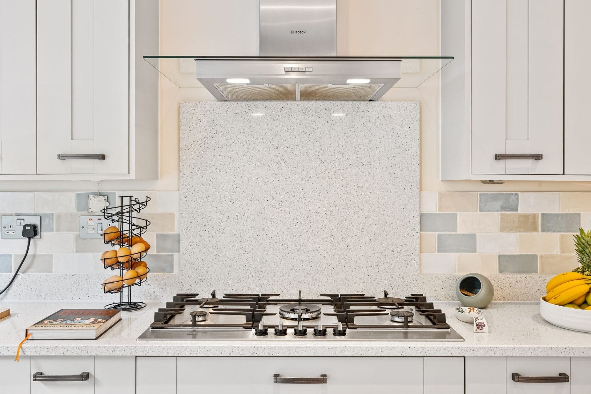 Modern, family kitchen with 5 ring gas hob with extractor fan, composite worktop, shaker style cabinets and double sink.