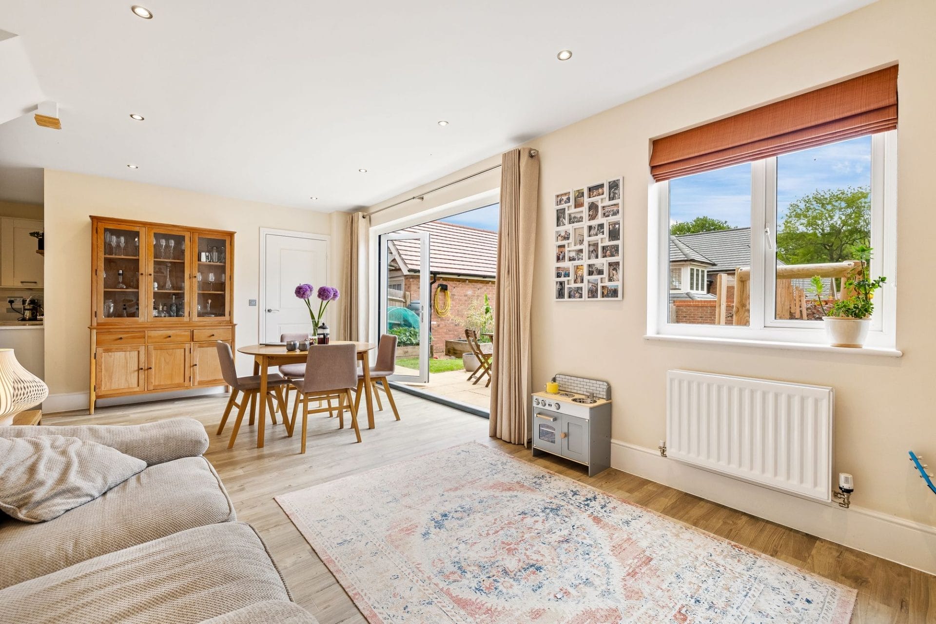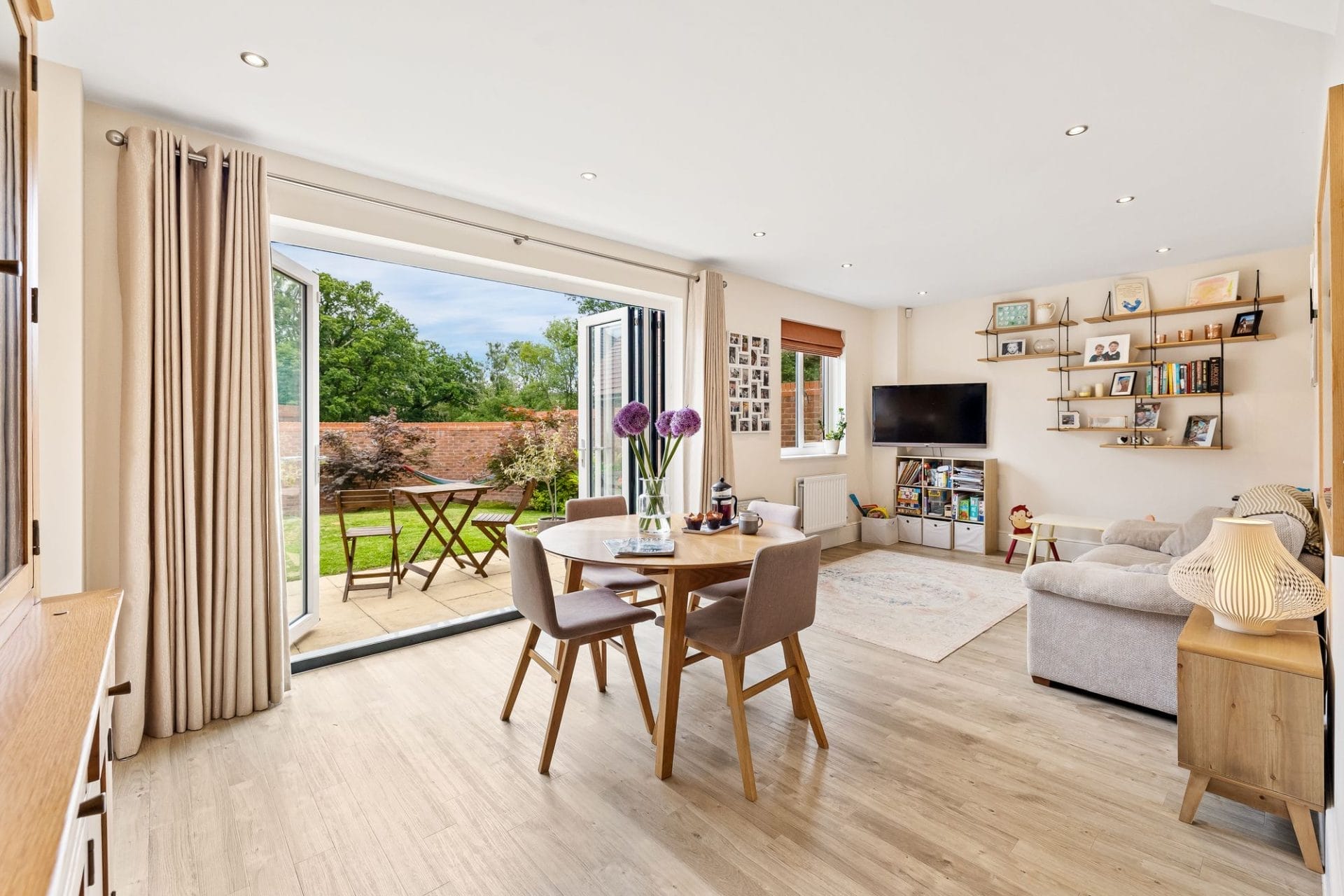 Open plan dining and family room with double doors opening to the patio and garden beyond.