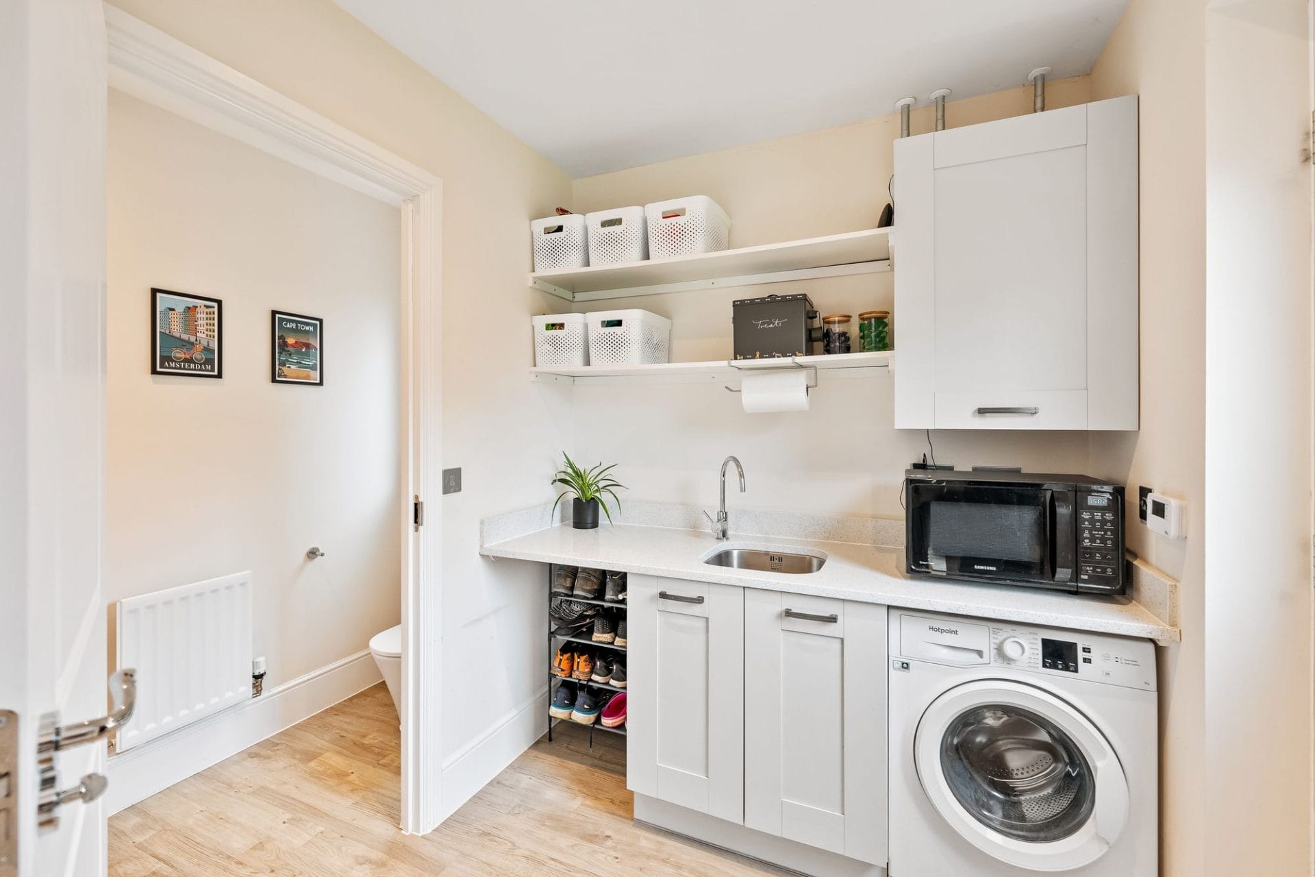 Useful utility room with plumbing for washing machine and tumble dryer. There is a cloakroom off the utility room and back door.