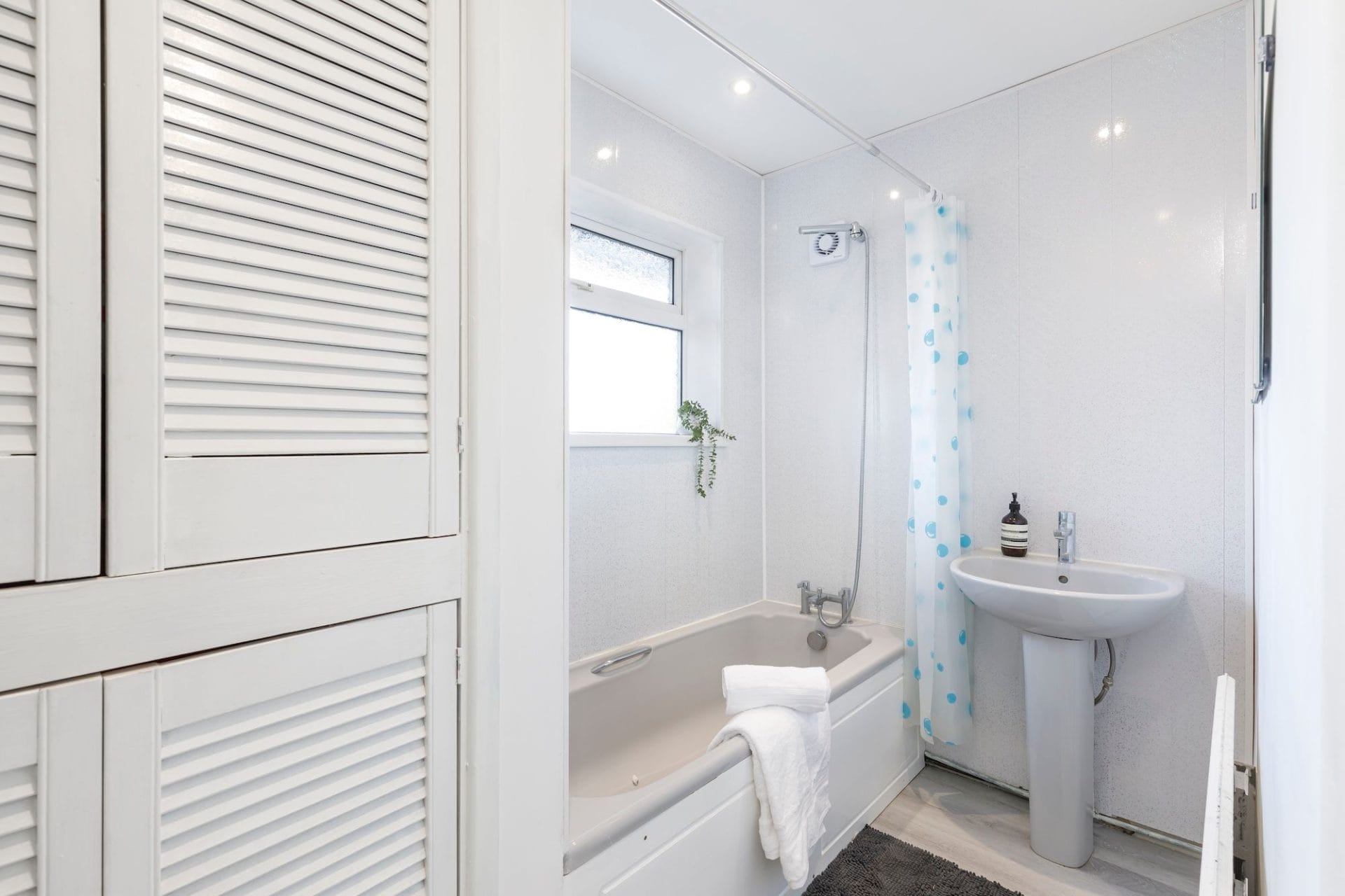 Bathroom with shower over bath and housing water tank. There is a separate wc.