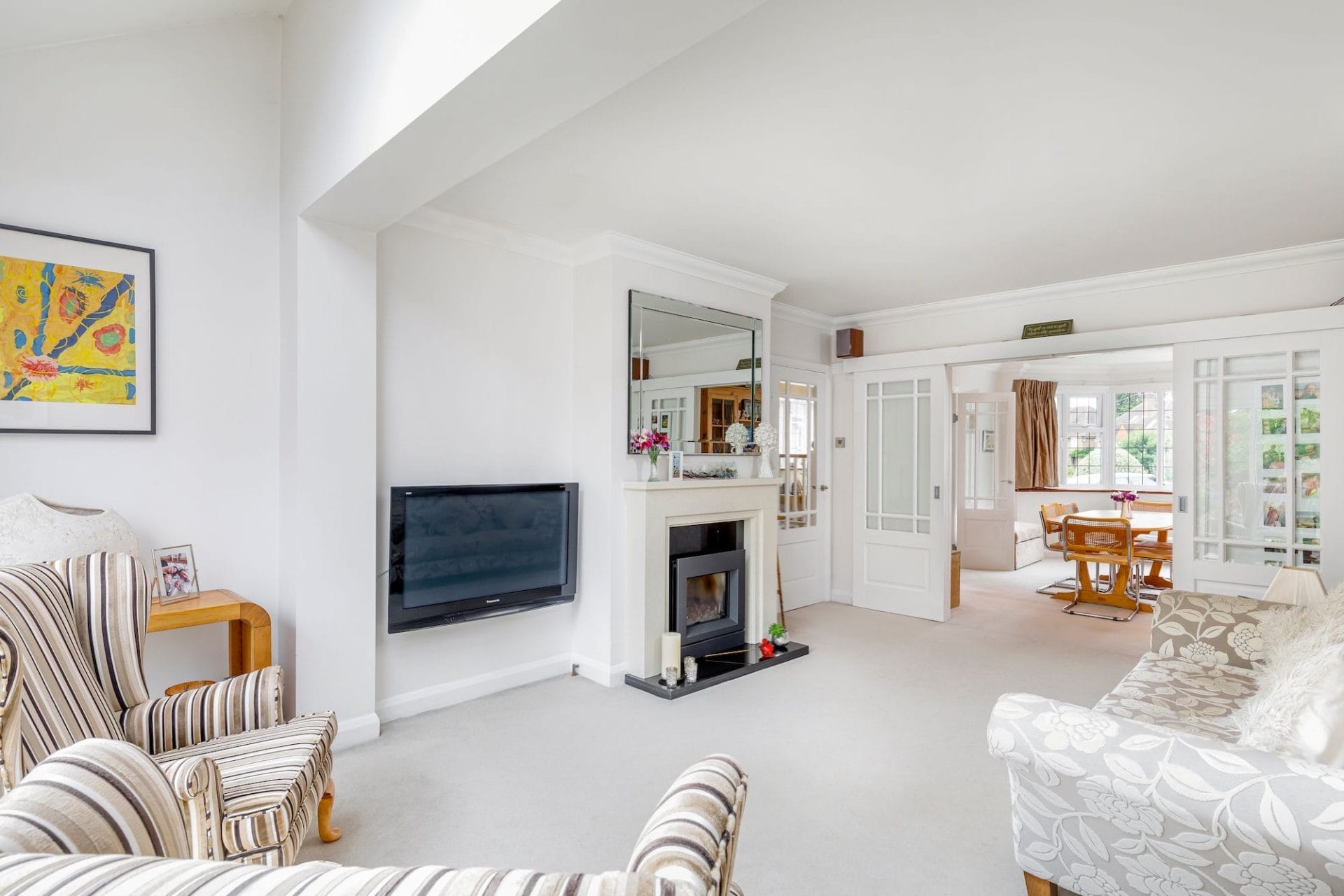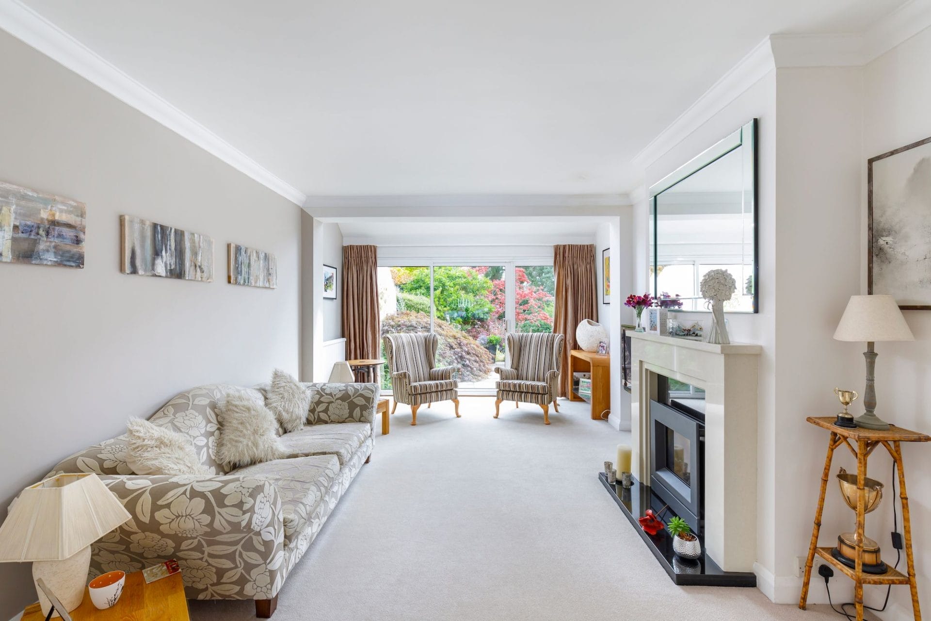 Lovely reception room with gas fire in marble fireplace and doors to patio.