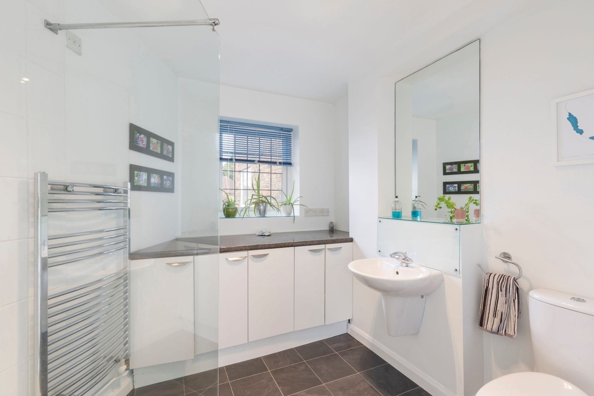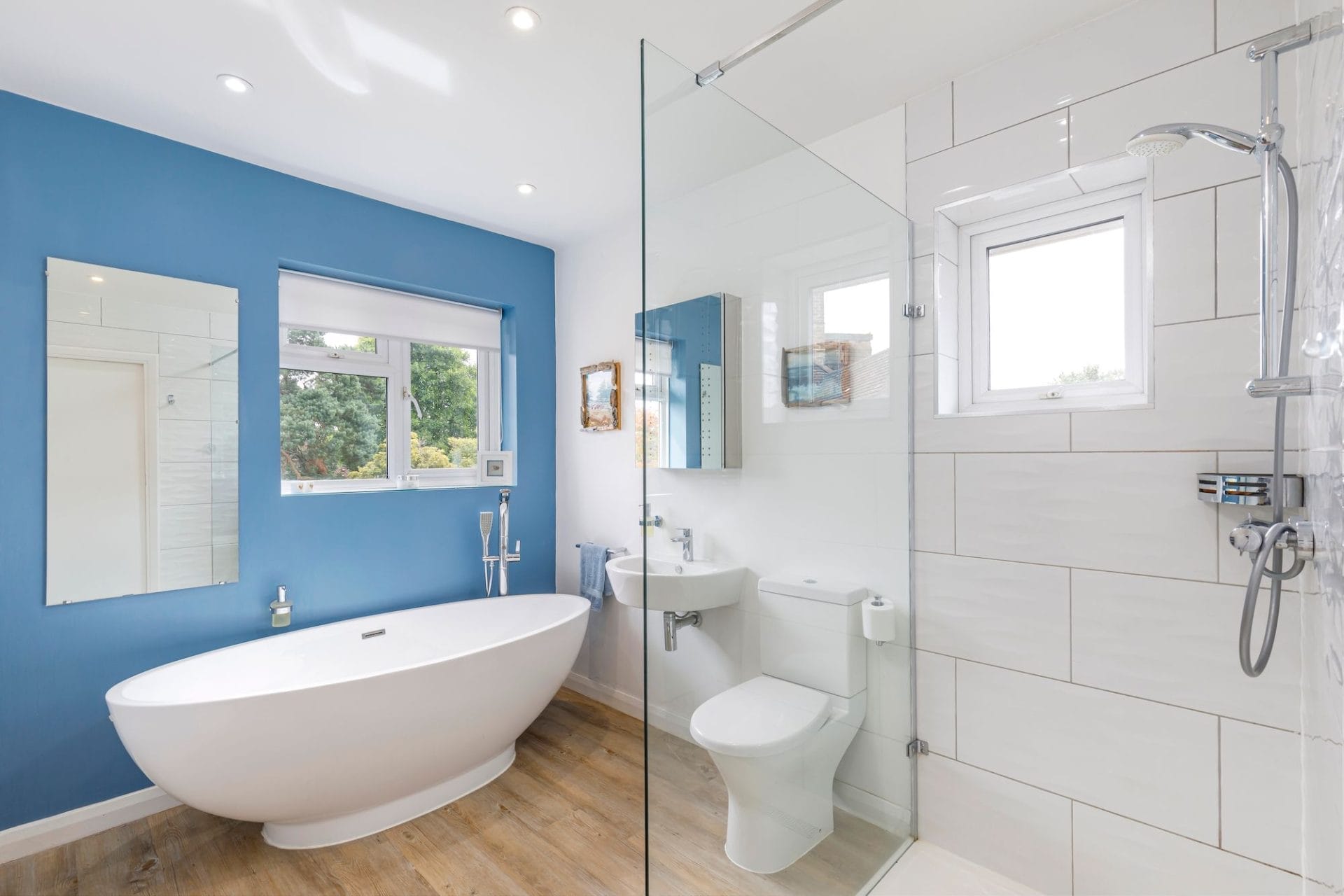 Modern family bathroom with large walk in tiled shower and lovely freestanding bath. There is an airing cupboard with slated storage shelving.