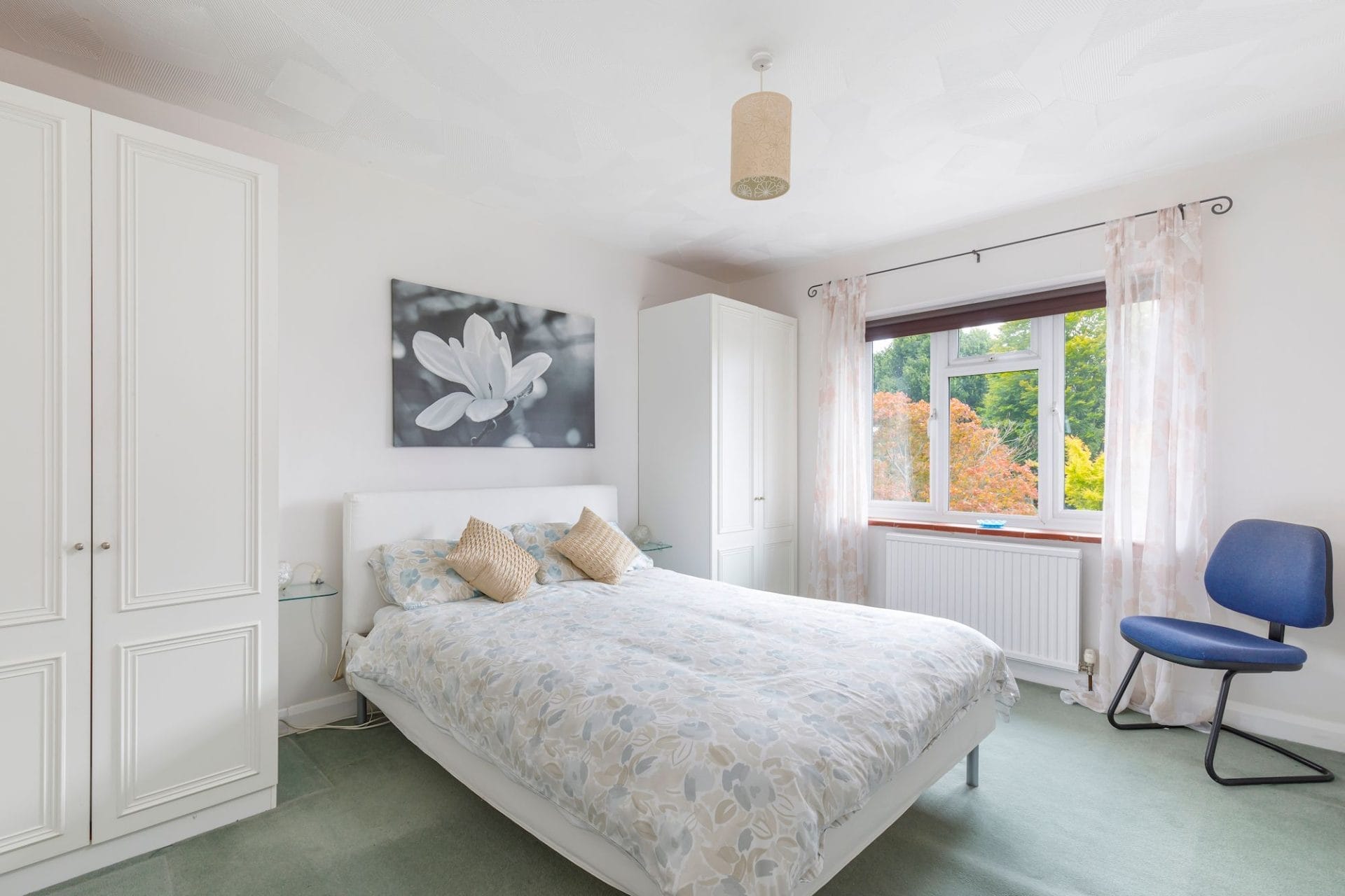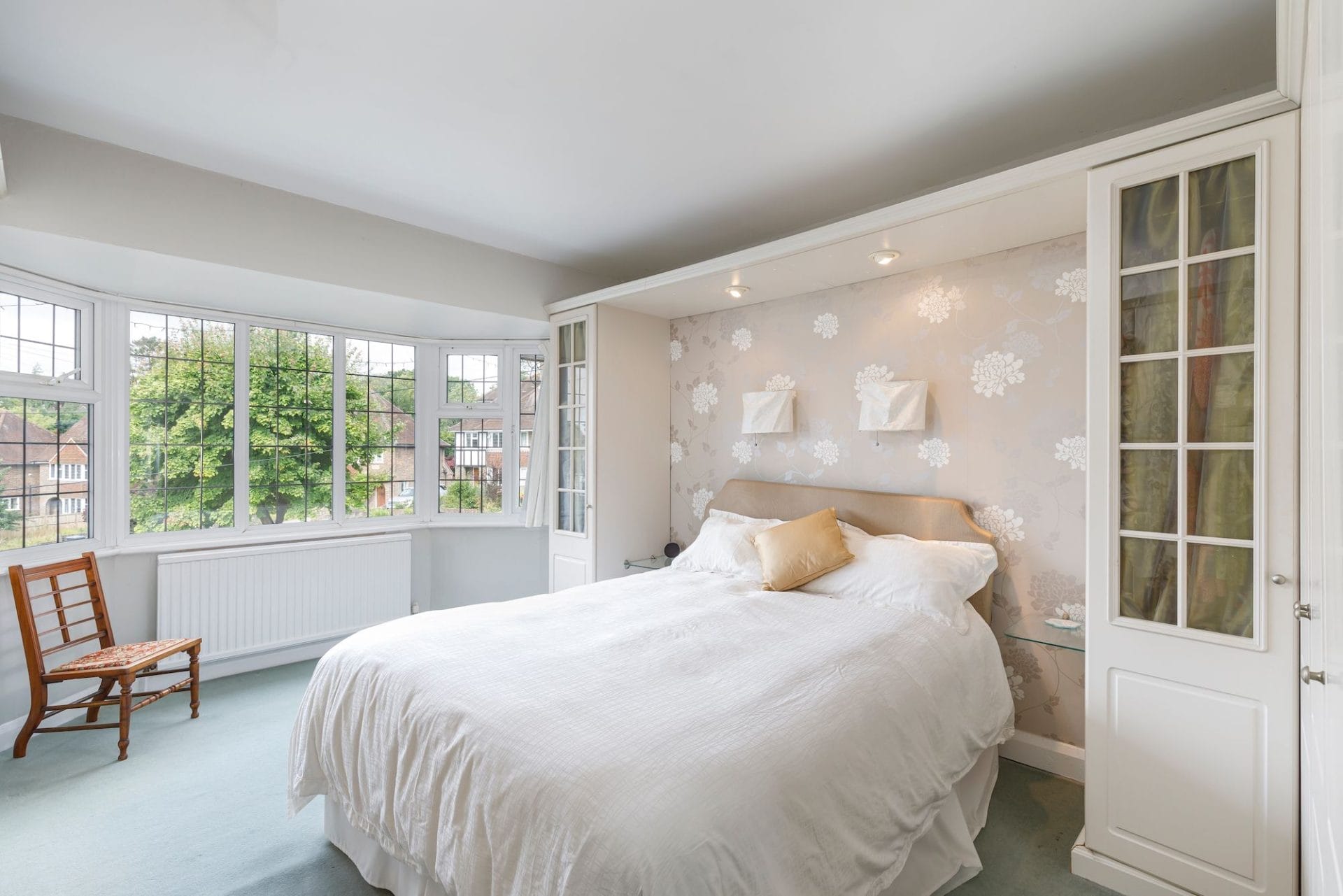 Large double bedroom with built in wardrobes and dressing table and traditional bay window.