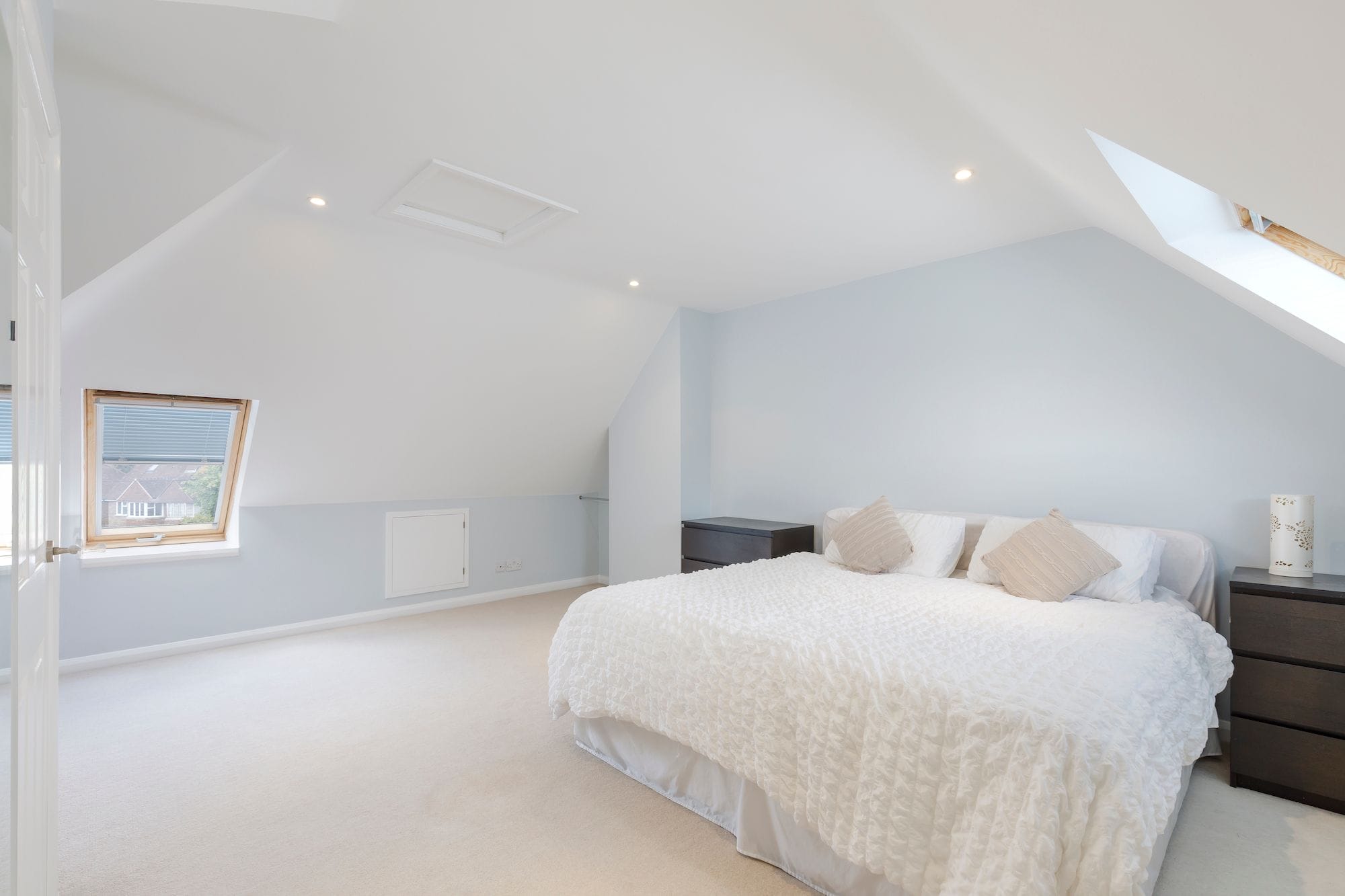 Fantastic master bedroom with far reaching views from the triple aspect windows and fitted with ample eaves storage.